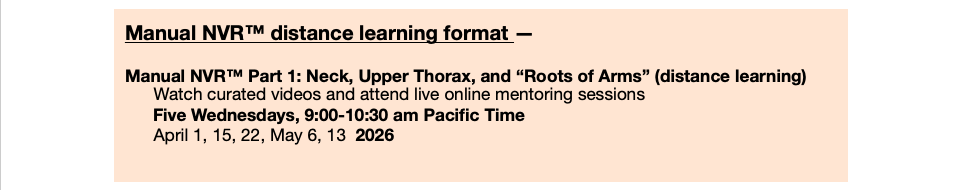 If you have already begun studying cranial, visceral, and/or neural work, you will find that NVR provides an integrative bridge between osteopathic-style work and the broad, deep touch of characteristic of myofascial work and structural integration.